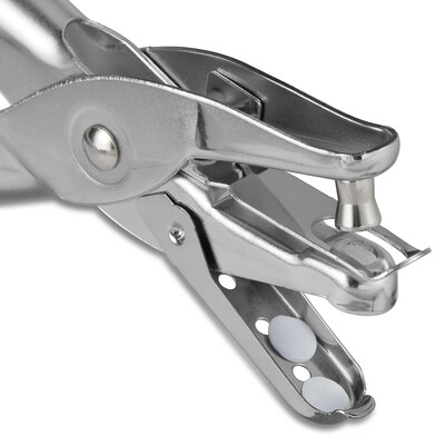 Create holes to link documents with this silver one-hole punch.