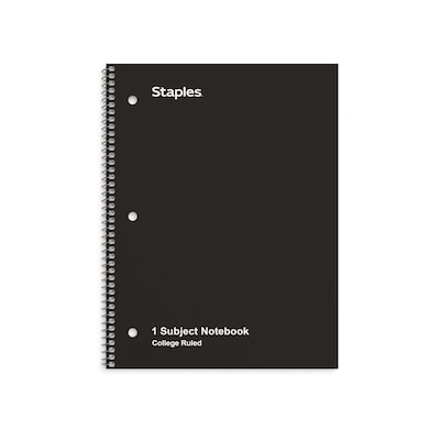 Stock up your supply closet with this 6-pack of 70-sheet notebooks. The spiral binding lets you seamlessly flip through the pages, and the college-ruled paper offers effective use of space and promotes clean writing. This Staples black 1-subject notebook features duplex cardstock cover for durability, and the 3-hole punched sheets are easy to insert into binders or manuals.
