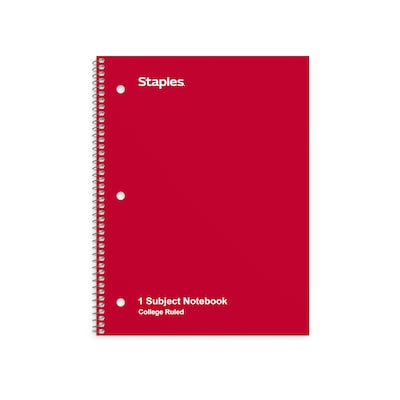 Take notes or collect your thoughts inside this Staples 8 x 10.5-inch red 1-subject notebook. Gather information in this red 1-subject notebook. The college-ruled format provides efficient space, making it easy to number lists or add notations to each line. A spiral binding lets you quickly flip through pages, and the perforated pages are easy to remove. This Staples 8 x 10.5-inch red 1-subject notebook contains 70 sheets, providing an ample supply to cover a single subject.