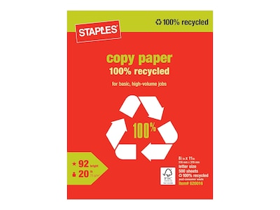 Stock up on Staples 100-percent recycled copy paper to keep your printer, fax and copier full for high-volume use. The 92 brightness rating gives your copy good contrast, and each page in this 500-sheet ream is free of acid for archival-quality documents. FSC Certified to ensure environmental responsibility, Staples 100-percent recycled copy paper is excellent for general office use.