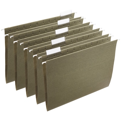 Keep track of invoices and client documents with this box of standard green letter-size hanging file folders. Coated hangers glide along the rails of file drawers and desktop filing systems for convenient access, and the included tabs and paper inserts let you arrange folders for efficiency. This Staples five-tab letter-size hanging file folder is manufactured of 12.5-point paper stock for lasting durability.