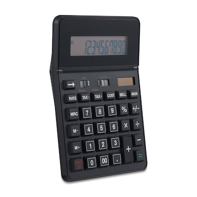 Support budget-planning activities with this multifunction desktop calculator. The angled display offers easy viewing, while the 12-digit LCD screen accommodates big numbers and long decimals. Perform financial and tax calculations with ease using the cost, sell and margin functions. This Staples 12-digit desktop calculator shuts off automatically when not in use to prevent battery drain and integrates solar technology for uninterrupted use.
