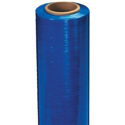 Staples® 80 ga Cast hand stretch film in blue color measures 18" x 1500' and stretches up to 250 percent. Film is ideal for carrier identification or inventory control and sold as 4 per case.