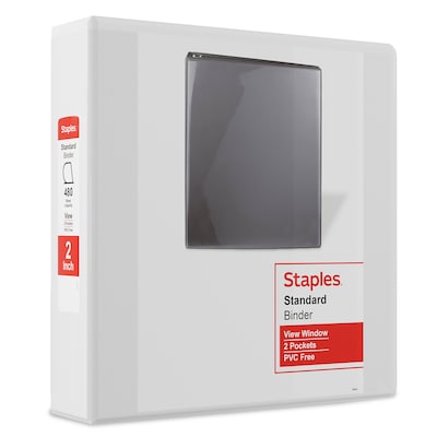 File documents by subject or account with these Staples standard view binders. The white color adds a professional look to office shelves, while the 480-sheet capacity provides ample storage for reports, forms and log sheets. Each binder comes with D rings, which lock into place to keep paper secure. These Staples standard view binders feature clear overlays, making it easy to add subject titles, images or tables of contents.