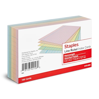 Staples 3" x 5" Index Cards, Lined, Assorted Colors, 100/Pack (TR51004)