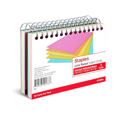 Flip quickly through your notes with these spiral-bound ruled index cards. The assorted neon colors let ink show up clearly and support easy readability. These Staples 3" x 5" assorted neon ruled index cards have convenient perforations for easy removal.
