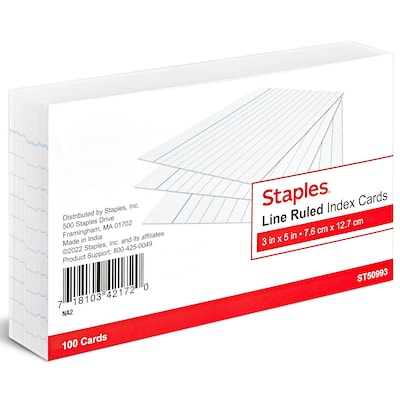 Staples 3" x 5" Index Cards, Narrow Ruled, White, 100/Pack (TR50993)