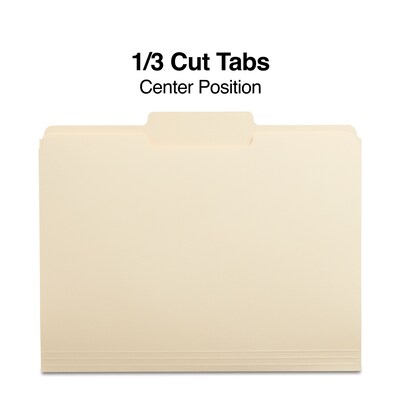 Ensure quick access to important paperwork with these manila file folders. The 1/3-cut tabs feature a center-position layout to keep labels neatly aligned, while the heavyweight paper construction withstands regular use. Each folder accommodates letter-size documents, keeping pages fully covered and protected. With 100 pieces in each box, these Staples letter-size manila file folders are ideal for office or classroom use.