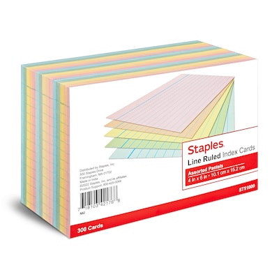 Staples 4" x 6" Index Cards, Lined, Assorted Colors, 300/Pack (TR51000)