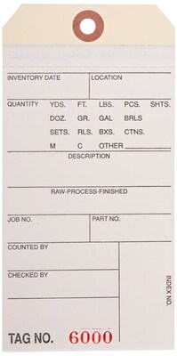 The 2 Part inventory tag has white carbonless bond with 10 point manila base stock and a 3/16" reinforced, tear resistant eyelet. 6 1/4" x 3 1/8" Tag has a case quantity of 6000-6499 and can be easily attached with string or wire.