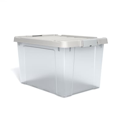 Rely on this clear, sturdy storage tote to keep items secure. With a 78.4-quart capacity, this container holds a variety of supplies. The latching lid maintains a firm grip to prevent contents from falling out, while built-in handles support easy lifting and transport. This Staples storage tote features sturdy plastic construction for lasting durability and a transparent design to easily identify the contents inside.