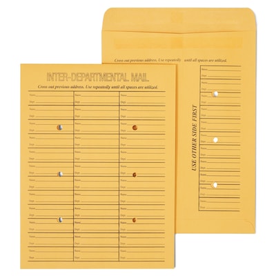 Send memos, forms and other paperwork to co-workers with these Staples 10 x 13-inch brown kraft resealable inter-departmental envelopes. Make it easy to share information with colleagues when you use these kraft inter-departmental envelopes. Preprinted forms let you label the name and department for each delivery, and the reusable design makes these envelopes a cost-efficient way to send documents throughout your office building. These Staples brown inter-departmental envelopes keep paperwork securely tucked inside.