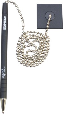 Staples® Anchor pen with black coloured has 1.0-mm medium point for neat writing experience and has a 24" chain for convenience. Pen has soft rubberized barrel and finger grip for comfortable writing, sold as 144 anchor pens per carton.