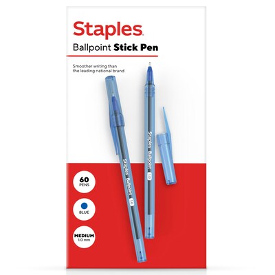 Experience smooth writing with Staples Ballpoint Pens featuring a medium 1.0mm point, perfect for everyday use. The pen's translucent barrel design allows for ink level monitoring. With a pack of 60, you'll always have a pen on hand when you need it.