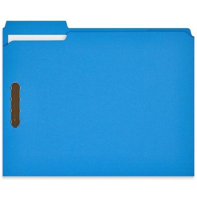 Transform your filing system with our Staples Fastener File Folders in blue Get the most out of your filing system with our blue letter-size file folders, crafted from durable 11-point stock for strength and reliability. Each folder comes with two K-style fasteners, which securely subdivide documents and make sure you’re maximizing the folder’s organization. The reinforced 1/3 tab provides some extra durability, which makes these folders perfect for heavy-duty and frequent use. Packaged in an eco-minded chipboard box with a vibrant color label, this box of 50 gives you both functionality and style for your workspace or home office. Take your document management up a notch with these flexible and strong file folders that will help you keep your workspace tidy and efficient.