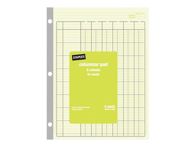 Keep track of finances, records and other important information with these six-column columnar books. Each one offers 50 three-hole-punched sheets, letting you conveniently add them to binders and folders for easy filing and archiving. These Staples columnar books come on green-tinted paper with green and black lines and six columns, making them ideal for recording keeping and accounting.