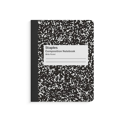 Carry this composition notebook in a briefcase or backpack for quick access to notes. With 80 pages, there's plenty of room for all your ideas, poems, doodles and notes, while the wide-ruled spacing lets you write with larger letters. This Staples Business Essentials 7.5 x 9.75-inch black and white wide-ruled composition notebook is a perfect size for taking on the go.