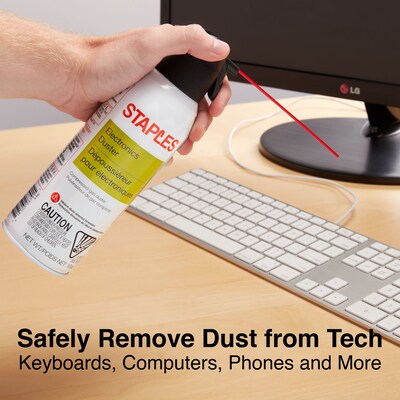 Maintain office equipment and easily remove dust, dirt and debris from electronics with this 2-pack of 10-ounce electronics dusters. Featuring an easy-to-use design, these dusters deliver concentrated streams of compressed air that blast crumbs and debris out of hard-to-reach areas without damaging delicate electronic components. These Staples electronics dusters fit easily in desk drawers and make it easy to keep debris out of keyboards and computers.