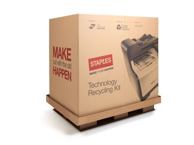 Staples environmentally friendly recycle boxes are great for recycling your electronic products and secure data desctruction. This Staples slectronics recycling box is e-Stewards Certified and R2 Certified.