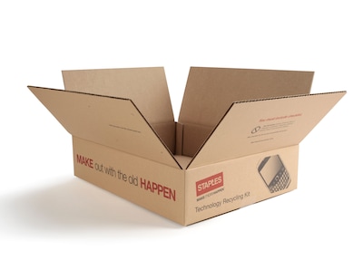 Staples environmentally friendly recycle boxes are great for recycling your electronic products and secure data desctruction. This Staples slectronics recycling box is e-Stewards Certified and R2 Certified.