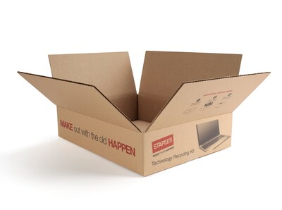 Staples environmentally friendly recycle boxes are great for recycling your electronic products and secure data desctruction. This Staples slectronics recycling box is e-Stewards Certified and R2 Certified.