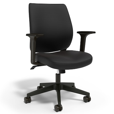 Work in comfort as you knock out your deliverables with this black fabric chair. Five swiveling casters give you full mobility around your work area, while the fabric upholstery of the contoured back and amply padded seat give you support all day, every day. Adjustable height, recline and tilt let you customize your seating for your own perfect posture and screen usage. This versatile task chair can be assembled with or without the fixed armrests, giving you a premium frame that meets ANSI/BIFMA standards at a great value. Reliable, efficient and versatile - the Staples Essentials fabric chair.