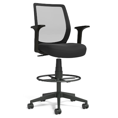 Personalize your seating experience with this mesh and fabric stool. An included tilt tension knob lets you effortlessly recline, while the mesh back allows free air circulation. With adjustable seat height, this stool helps ensure good posture and easy viewing posture. The contoured padded seat provides ergonomic comfort, and an armless design fits easily in small cubicles. This Essentials black mesh and fabric stool has a five-star base and casters for easy maneuverability, and the foot ring supports your feet.