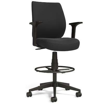 Get premium back support during long workdays from this black fabric stool. The adjustable seat height allows easy customization and accommodates different preferences, while the premium fabric upholstery offers breathable comfort. Five 360-degree casters let you move from your desk to the nearby print station in a fluid glide, and the convenient foot ring provides support for your tired feet. The contoured and cushioned seat offers plush comfort. This Essentials black fabric stool features fixed armrests for additional support and meets ANSI/BIFMA standards for quality, safety, and performance.