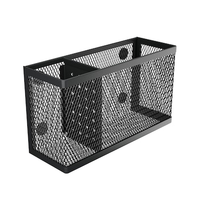 The Staples Magnetic Organizing Bin enhances your workspace by utilizing unused space on metal filing cabinets. Crafted from durable wire mesh, it securely attaches with strong magnets and features two compartments to neatly store pens, notepads, scissors, and other desk essentials. Its sleek, practical design keeps supplies organized and within easy reach, creating a clutter-free environment in any workspace.
