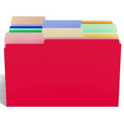 Protect paperwork inside these letter-size folders. An assortment of five hues lets you color-code your filing system, and the 1/3-cut tab layout allows for custom labeling and easy organization. The sturdy heavyweight paper construction withstands wear and tear for convenient reuse. These Staples letter-size assorted-color top-tab file folders offer full coverage for documents and come in a 100-count box to help keep your supply closet fully stocked.
