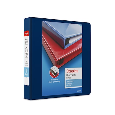 Safeguard important papers inside this Staples heavy duty view binder. This folder ?features easy locking 1.5-inch rings with a gap-free, back-mounted ring design to prevent misalignment and keep pages secure. Wider front and back panels provide coverage for dividers and sheet protectors, while the archival-safe material protects ink and toner on printed papers. A front view pocket offers space for a cover page or syllabus. Four stacked pockets inside this Staples heavy-duty view binder let you keep handouts or homework within reach.