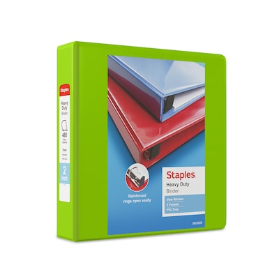 Enjoy the convenience of smooth-turning pages with this Staples heavy duty 2-inch D-ring view chartreuse binder.