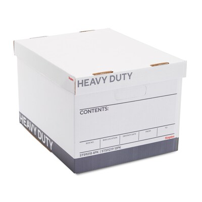 Move office documents with these corrugated heavy-duty storage boxes. The easy-grip handles make them easy to carry. A preprinted write-in area allows for easy labeling, while the 725-pound stacking strength makes them safe for packing on pallets. With a locking lift-off lid, these Staples corrugated heavy-duty storage boxes secure the contents, and the generous dimensions fit up to legal-size reports.