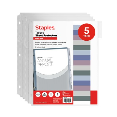 Staples Tabbed Sheet Protectors offer a durable solution for organizing and protecting your documents. These clear protectors fit standard 8.5" x 11" sheets and come in a convenient 5/tab set, making them ideal for categorizing and accessing your important papers with ease.