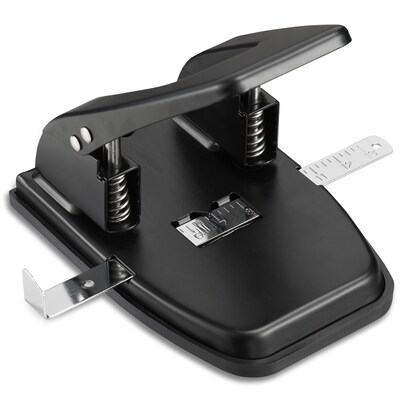 Create dual center-to-center holes with this two-hole punch. Made of durable steel construction, this sturdy hole puncher stands up to daily use. This two-hole punch can accommodate up to 28 sheets of standard 20-pound paper at once, letting you finish tasks faster. A chrome-plated adjustable guide on this Staples two-hole punch makes paper placement easy, and the attached chip tray catches paper bits to eliminate messes.