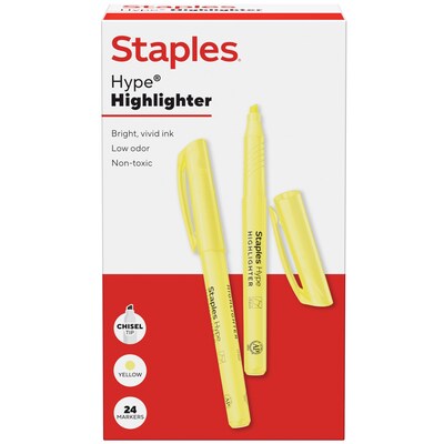 Illuminate your documents with the Staples Hype Stick Highlighter. Its vibrant yellow ink ensures your important notes stand out, while the chisel tip allows for both broad highlighting and fine underlining. With a pack of twenty-four, you'll have plenty on hand for all your highlighting needs. This non-toxic highlighter is safe for everyday use, making it a reliable choice for students and professionals alike.