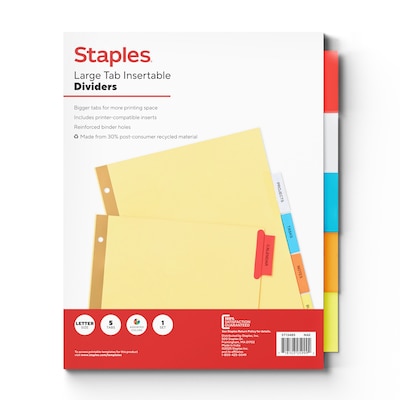 Staples Large Tab Insertable Paper Dividers, Assorted Colors, 5-Tabs (13485/11109)