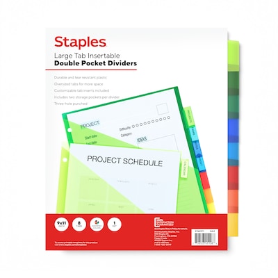 Organize your documents effortlessly with Staples Large Tab Plastic Two-Pocket Insertable Dividers.