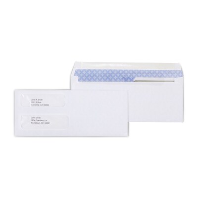 Enjoy the convenience of these double-window envelopes. Each envelope has a gummed flap that seals securely once moisture is applied, ensuring it doesn't close until you're ready, while the security tint helps keep confidential information private. These Staples check-size laser envelopes have a double window, so you don't need to manually apply shipping labels and return addresses labels.
