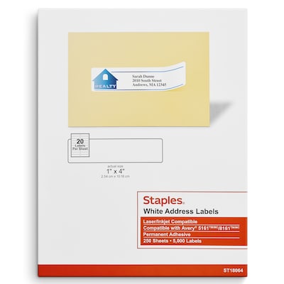 Staples Laser/Inkjet Address Labels, 1" x 4", Bright White, 20 Labels/Sheet, 250 Sheets/Box, 5000 Labels/Box (ST18064-CC)