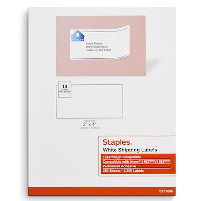 Staples Laser/Inkjet Shipping Labels, 2" x 4", White, 10 Labels/Sheet, 250 Sheets/Pack, 2500 Labels/Box (ST18066-CC)