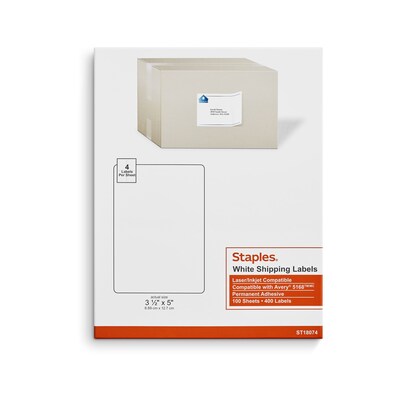 Staples Laser/Inkjet Shipping Labels, 3 1/2" x 5", Bright White, 4 Labels/Sheet, 100 Sheets/Pack, 400 Labels/Box (ST18074-CC)