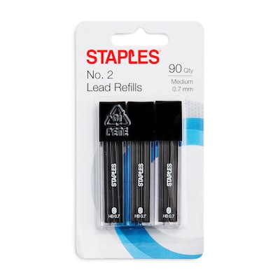 Staples HB-Medium pencil lead refills are packaged in three tubes of thirty leads each. The tubes give you secure and convenient storage, and you'll have extra tubes available for big writing projects.