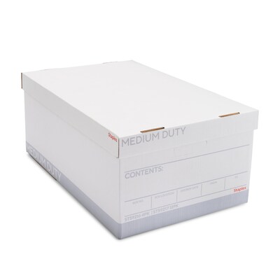 Get quick access to archived documents with these corrugated medium-duty storage boxes. The lift-off lid keeps dust off the contents, while the medium-duty construction lets you store files of up to 500 pounds. Boasting easy-grip handles, these Staples corrugated medium-duty storage boxes are easy to carry, and the preprinted write-in area allows labeling for effortless identification.