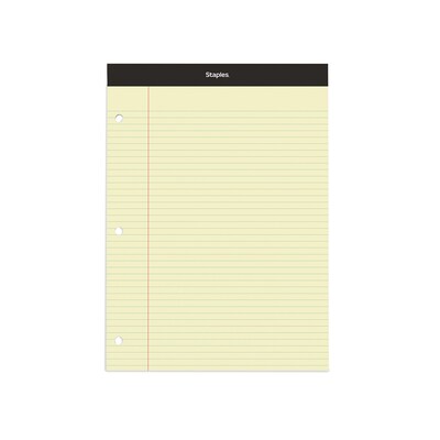 Keep your desk stocked with this canary notepad. The standard size and narrow ruling offer ample space for notes and sketches, while the perforated pages let you easily remove sheets as needed. Prepunched holes are compatible with binders so you can save your work. With 100 sheets, this Staples 8.5 x 11.75-inch canary narrow ruled notepad supports office or classroom use.