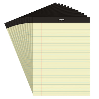 Fill the office supply cabinet with these canary 50-sheet notepads. The wide ruling helps keep your writing neat and easy to read, while the convenient perforations let you tear off a page to share. These Staples 8.5" x 11.75" canary wide ruled notepads are bound at the top so you can flip through the pages and find information easily.