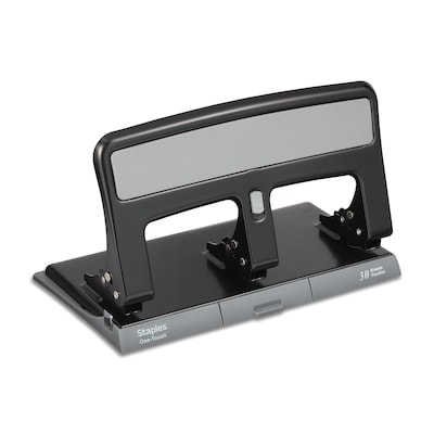 Maximize efficiency with this heavy-duty hole punch. A 30-sheet capacity makes it easy to punch more holes in less time. The paper guide helps ensure perfect alignment, while the built-in punches create evenly spaced holes. This Staples One-Touch hole punch includes an easy access tray for frustration-free cleaning and a cushioned handle for comfortable, long-term use.