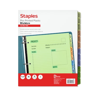 Stay organized all year with Staples Preprinted Plastic Dividers, featuring vibrant multicolor tabs for each month.