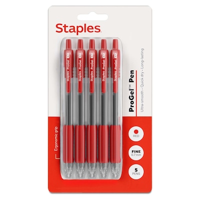 Make every pen stroke stand out with the impressively smooth, quick drying and ergonomic Staples® ProGel™ Retractable Pen in red. Tested better than the competition for smoothness and comfort, this 5-pack of 0.7mm fine-point pens offers a more consistent ink flow and superior writing experience. Avoid unwanted marks or lost caps with a retractable design that makes for easy packing. They’re also airplane-safe, so you can even take these gel pens on your next flight and get to your destination with no surprise ink leaks.