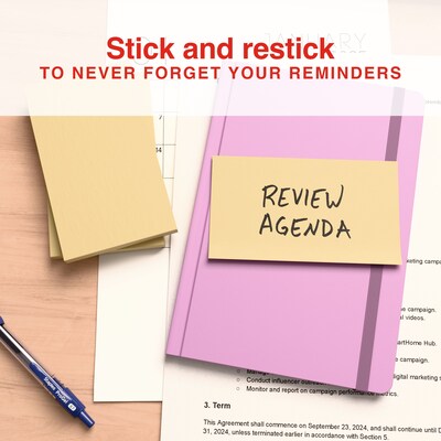 Jot down notes and reminders with convenience on these Staples Stickies yellow recycled notes. The generously sized notes feature a unique adhesive specially designed for use with paper and also stick and restick to just about any hard surface. These Staples Stickies recycled notes are made from 30 percent post-consumer content, making them an eco-friendly choice.